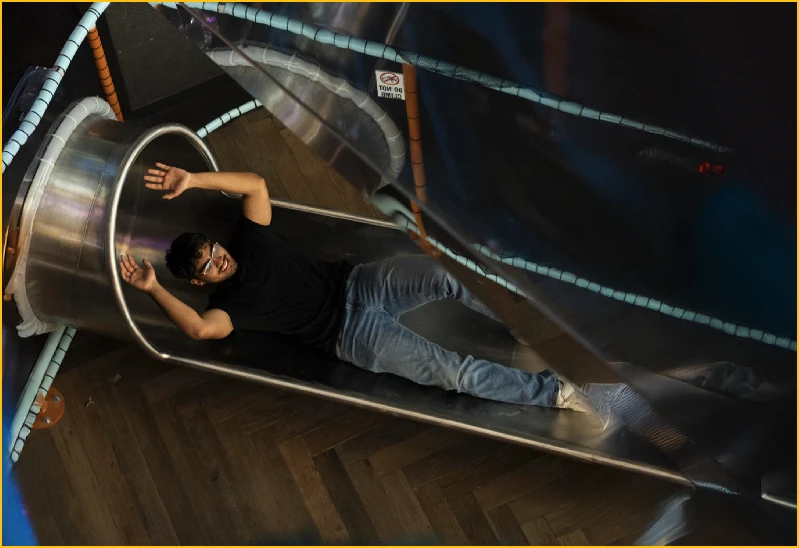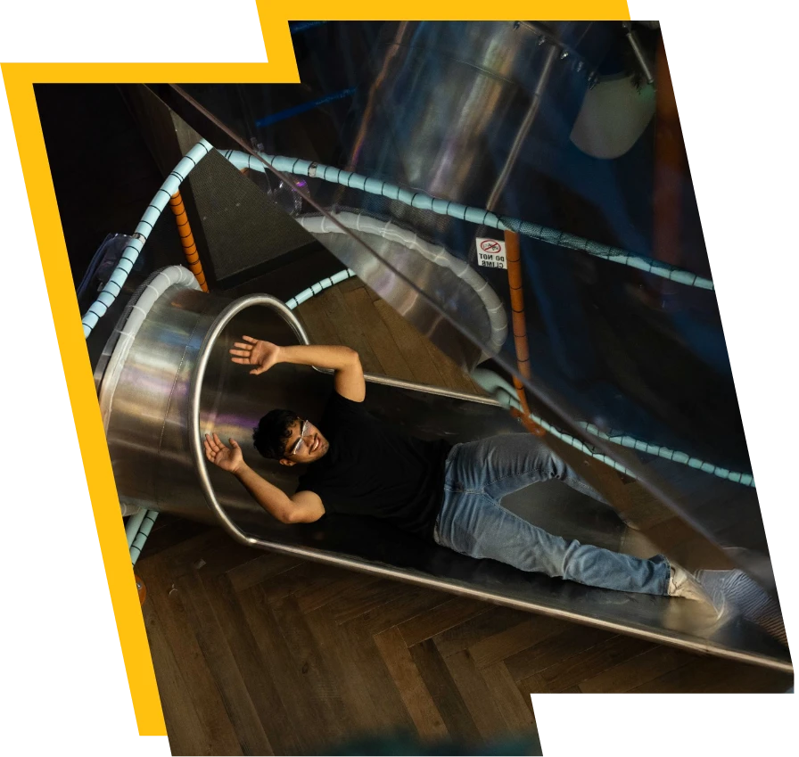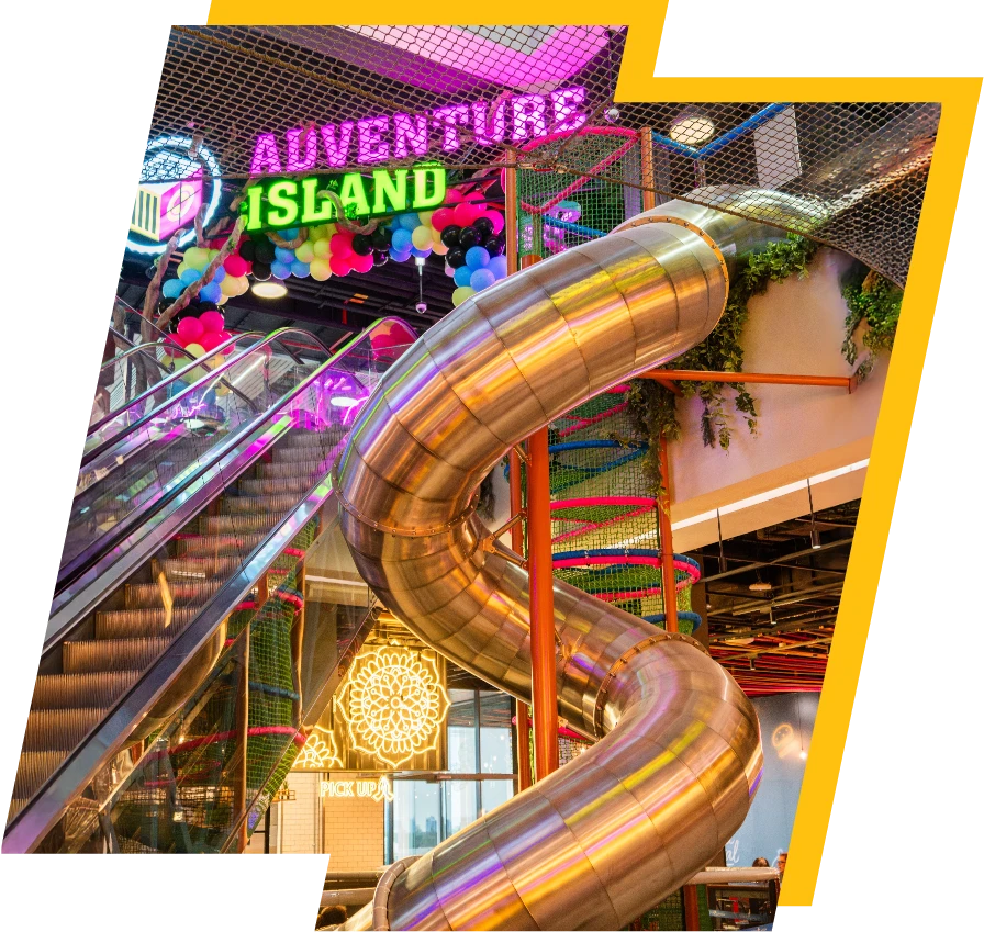 Experience the thrill of the TANGLE DROP, drop down on the spiral slide, only to climb back up a tangle vertical net. This loop of action ensures a fun and active experience for participants aged 5 and above. A great way to tap into your younger self.